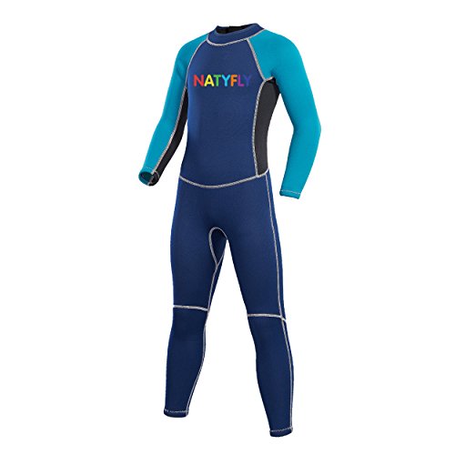 NATYFLY Neoprene Wetsuits for Kids Boys Girls Back Zipper One Piece Swimsuit UV Protection-Brand (Blue-2MM-Long Sleeve, S-For Height 37”-42”)