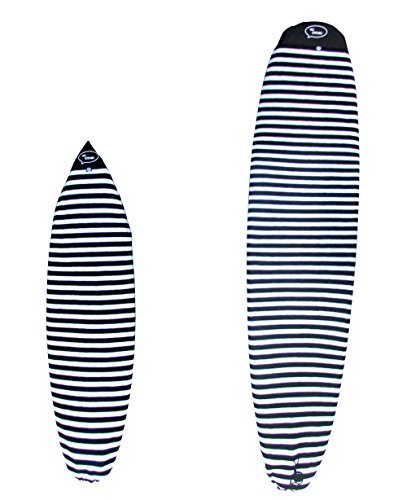 I recently purchased two of the socks a 6′-6″ and a 8′-6″, for a 6′ board and a 8′ fun board. They fit really well, I purchase them about 6″ longer then the board as suggested. This give plenty of room to leave the fins on on both boards. Both boards that I have are pretty wide with plenty of volume and the sock stretches enough to accommodate the board and still pretty easy to put in on and off. The material seams robust, so far I took them to the ocean a couple of times in the bed…