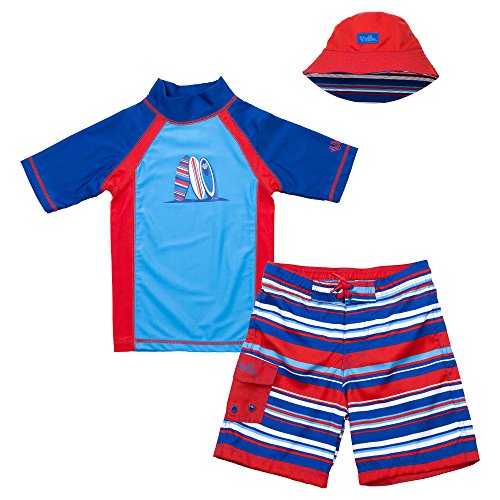 My LO is avg weight but above avg height for 4. The UV Skinz size 5T swimsuit fits as expected. A little large but still wearable. He can grow into it & it can last a couple years. The material is very stiff but im hoping it will soften over time with washings. The hat fits a bit goofy but the kiddo loves it so thats all that counts in my book. My LO picked this swim set himself & i wasnt sold on the loud color but it really does looks much better than pictured. Overall very happy with purchase…
